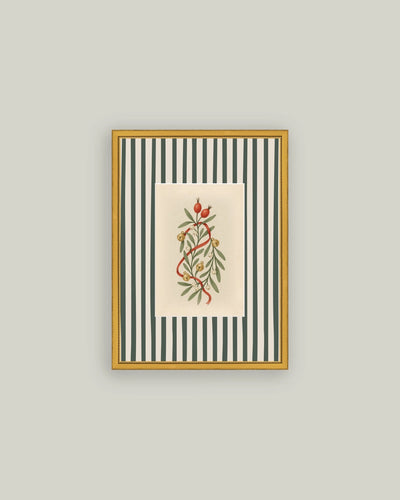 Holly Bells On Stripes Framed Antique Art 8x10