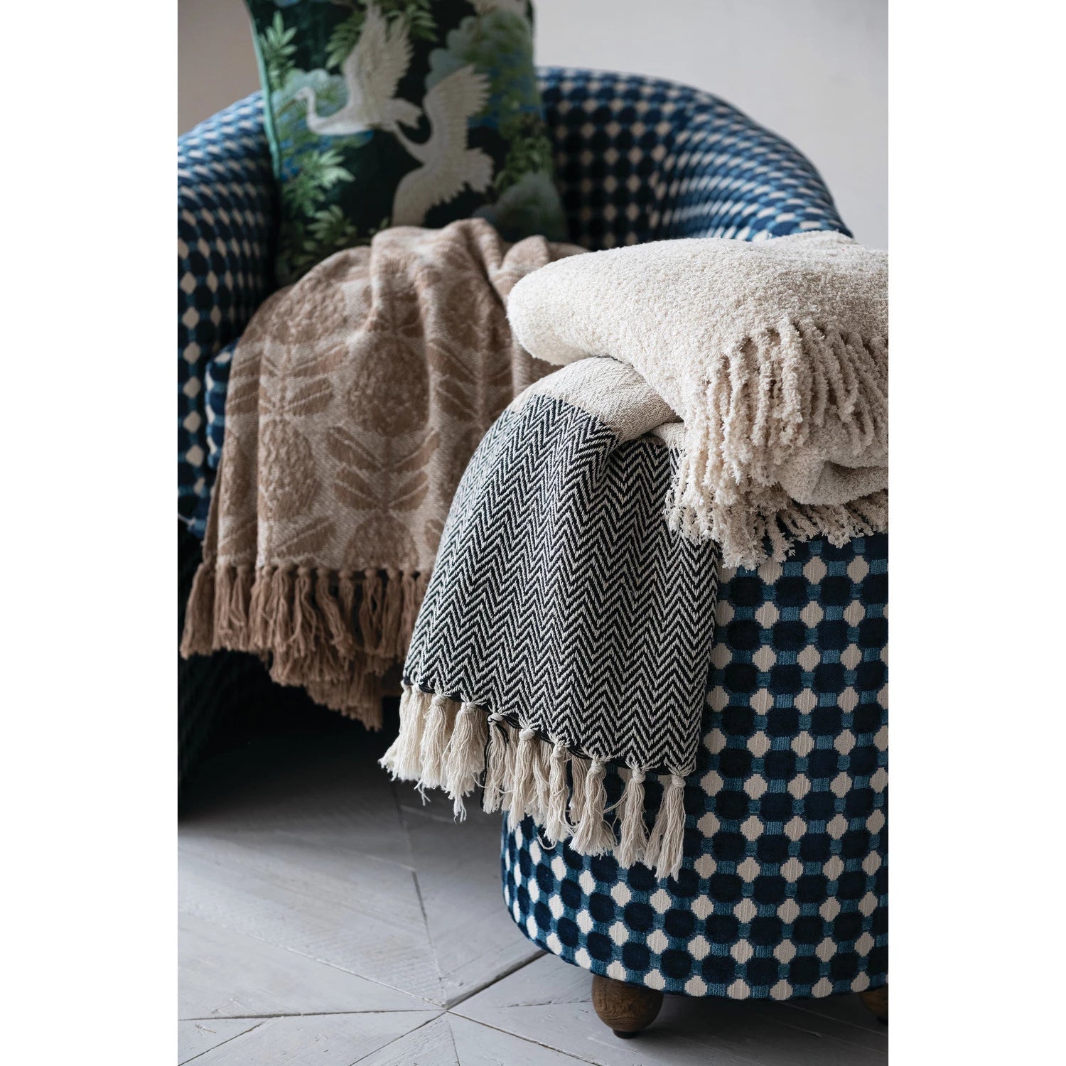 Wrap yourself in sustainable comfort with this beautifully crafted throw blanket. Woven from a recycled cotton blend, it combines eco-conscious materials with timeless style. The intricate jacquard weave showcases an elegant floral pattern in natural and beige tones, while decorative fringe adds a finishing touch. Measuring 60" x 50", it's the perfect size for draping over sofas, armchairs, or beds. Ideal for layering warmth while supporting environmentally responsible choices.