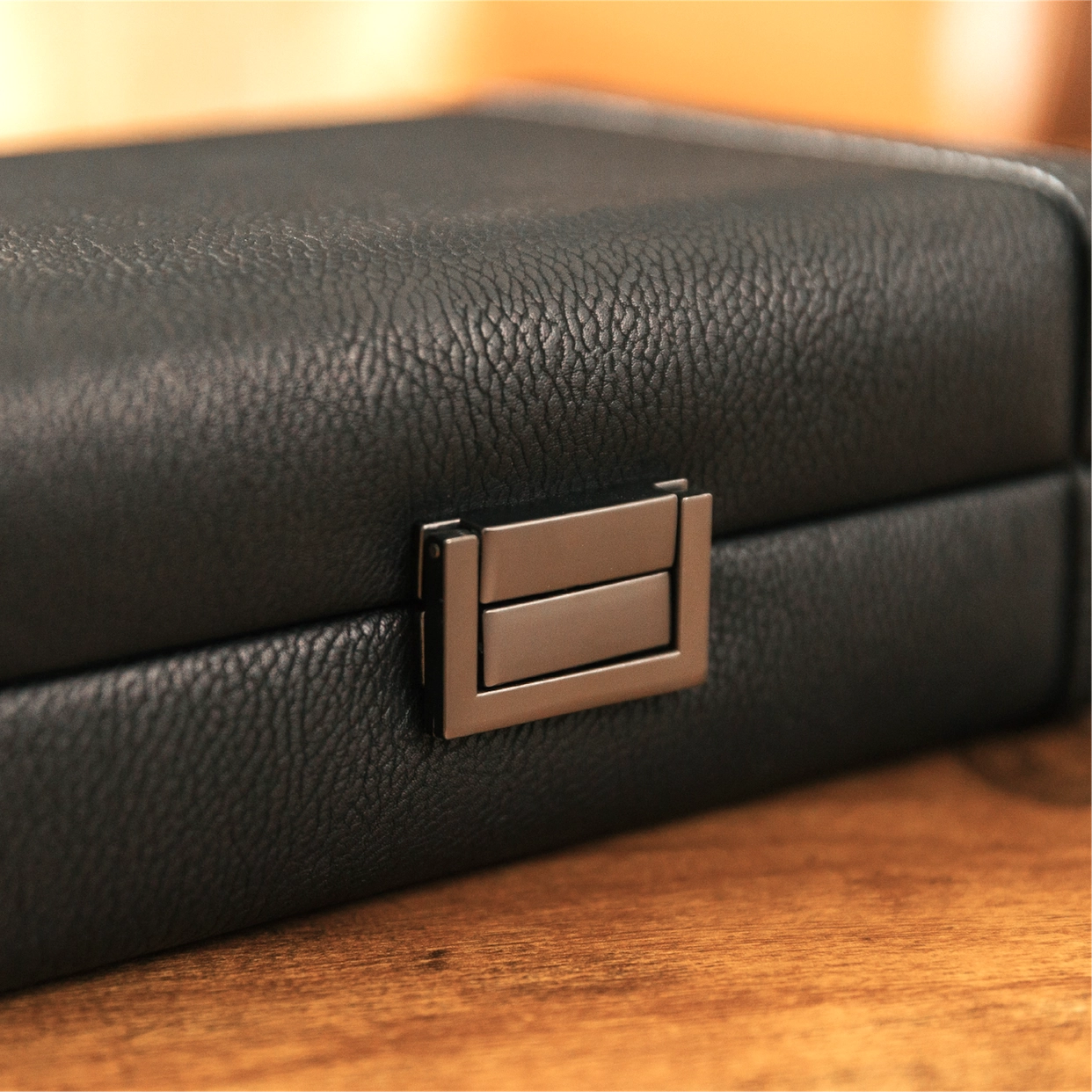 The Maxwell travel cigar case is a must-have cigar accessory, perfect for those who enjoy indulging in their favorite cigars while on the go. The durable hardshell case, wrapped in premium vegan leather, ensures your cigars are protected from any damage during travel. What’s more, the Maxwell can fit up to 8 large cigars and holds them in place securely with an elastic band. The inside is lined with luxurious Spanish cedar wood, which provides the perfect environment for preserving the aroma and flavor notes of your precious cigars. With the Maxwell travel cigar case as your trusty companion, you can take your treasured stogies wherever your journey leads.