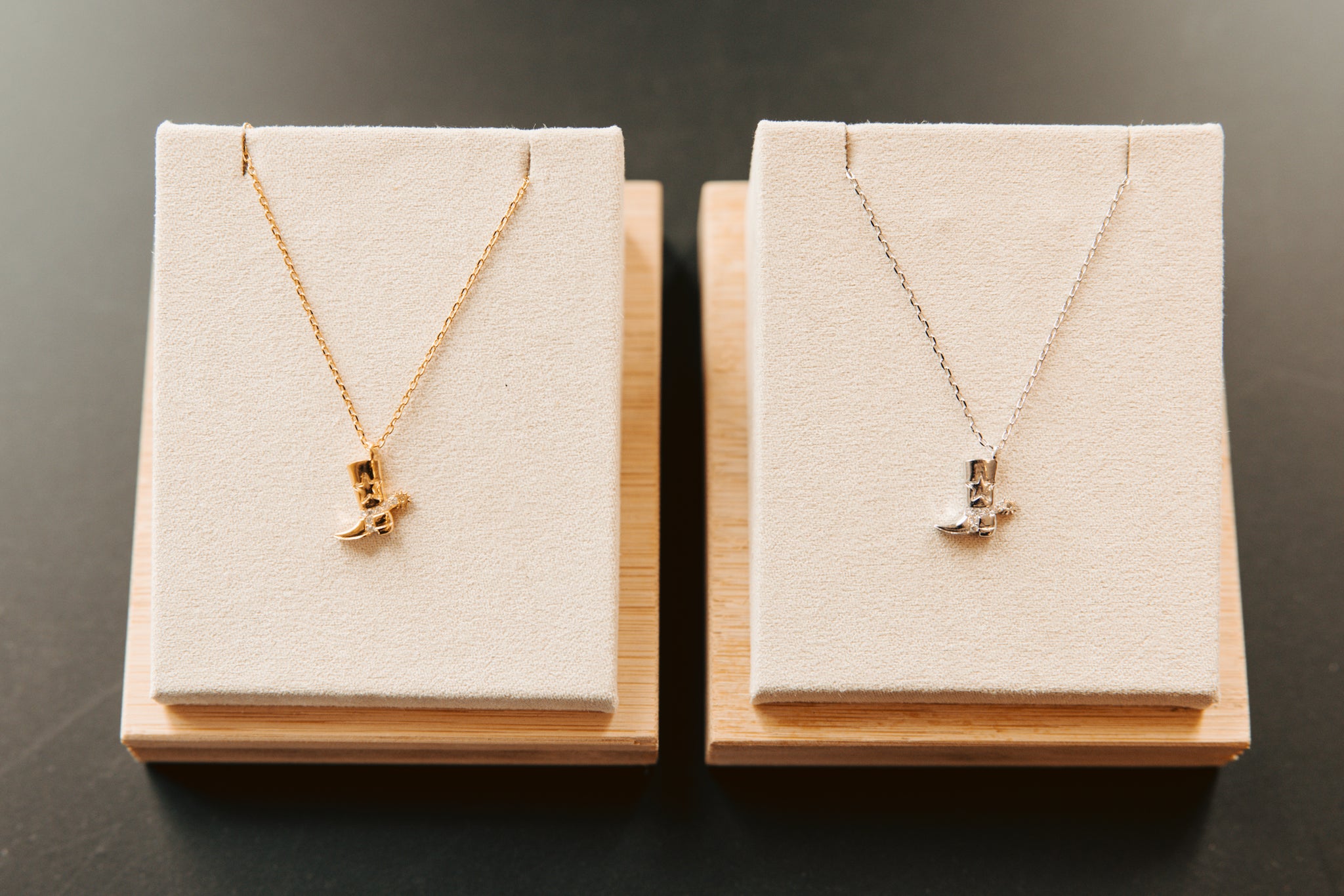 Cowboy boot pendant on a 16" chain, available in gold (18k gold dipped brass) and silver (rhodium plated brass).