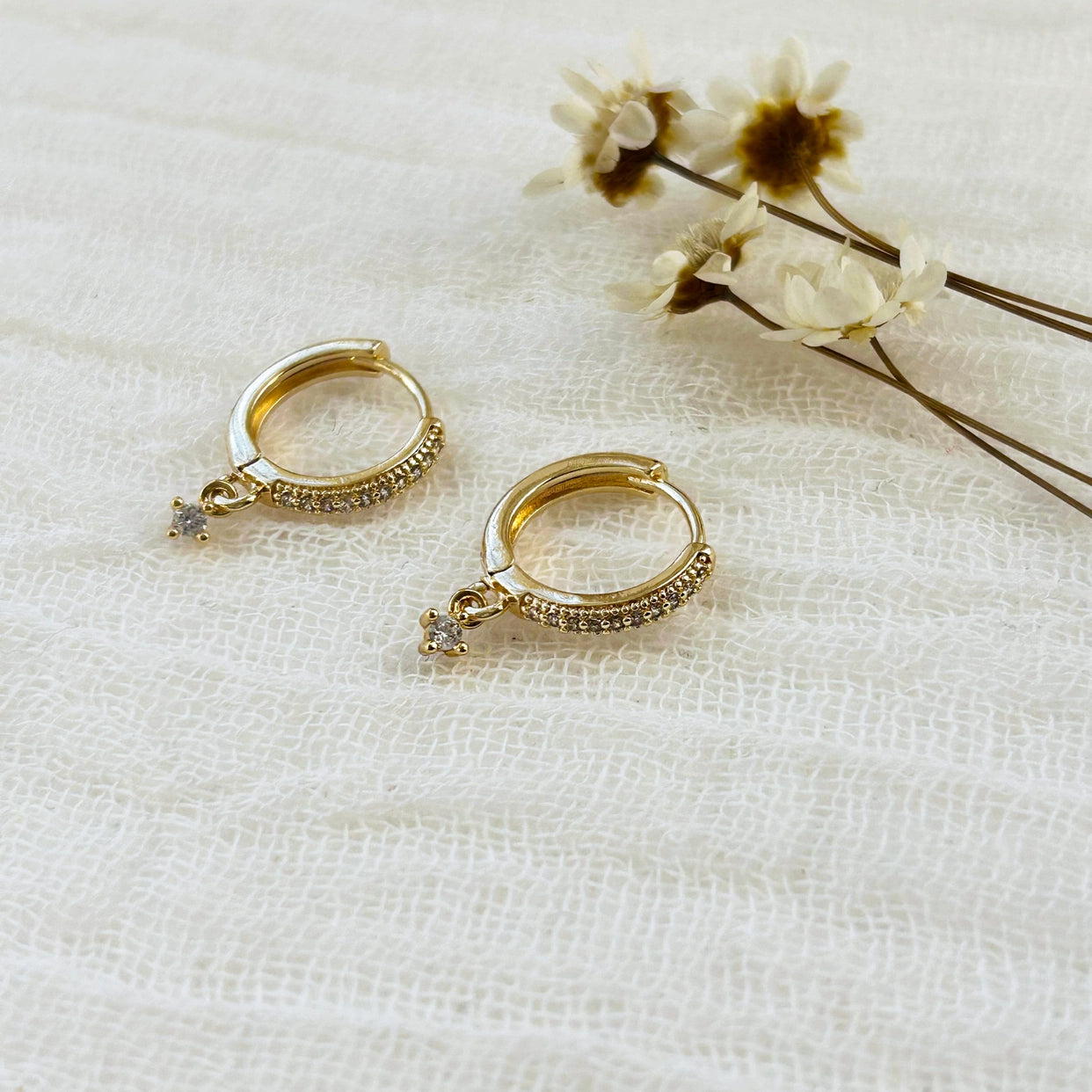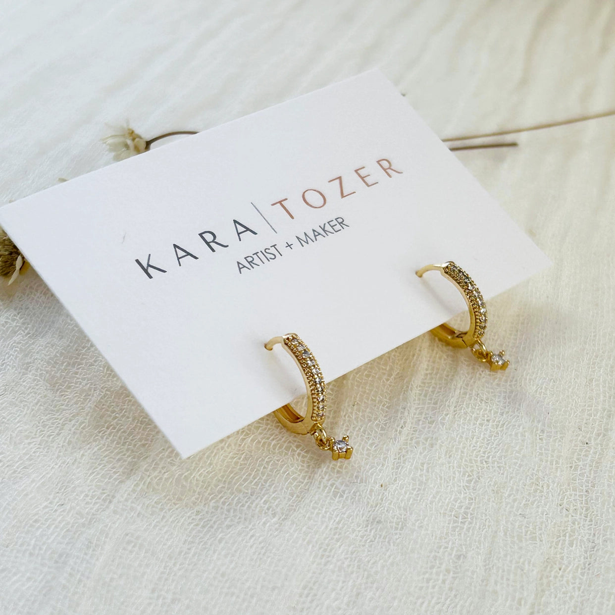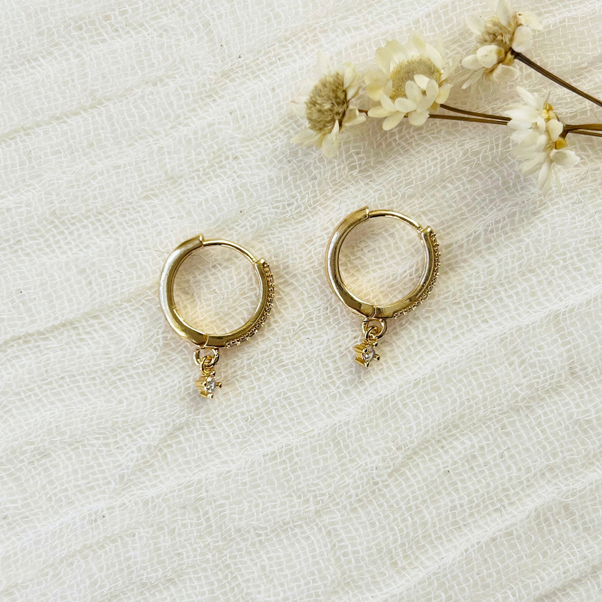 One of our favorite new charm styles that feature an ultra dainty solitaire charm and cubic zirconia lined hoops. Perfect to wear alone or for stacking with other earrings.