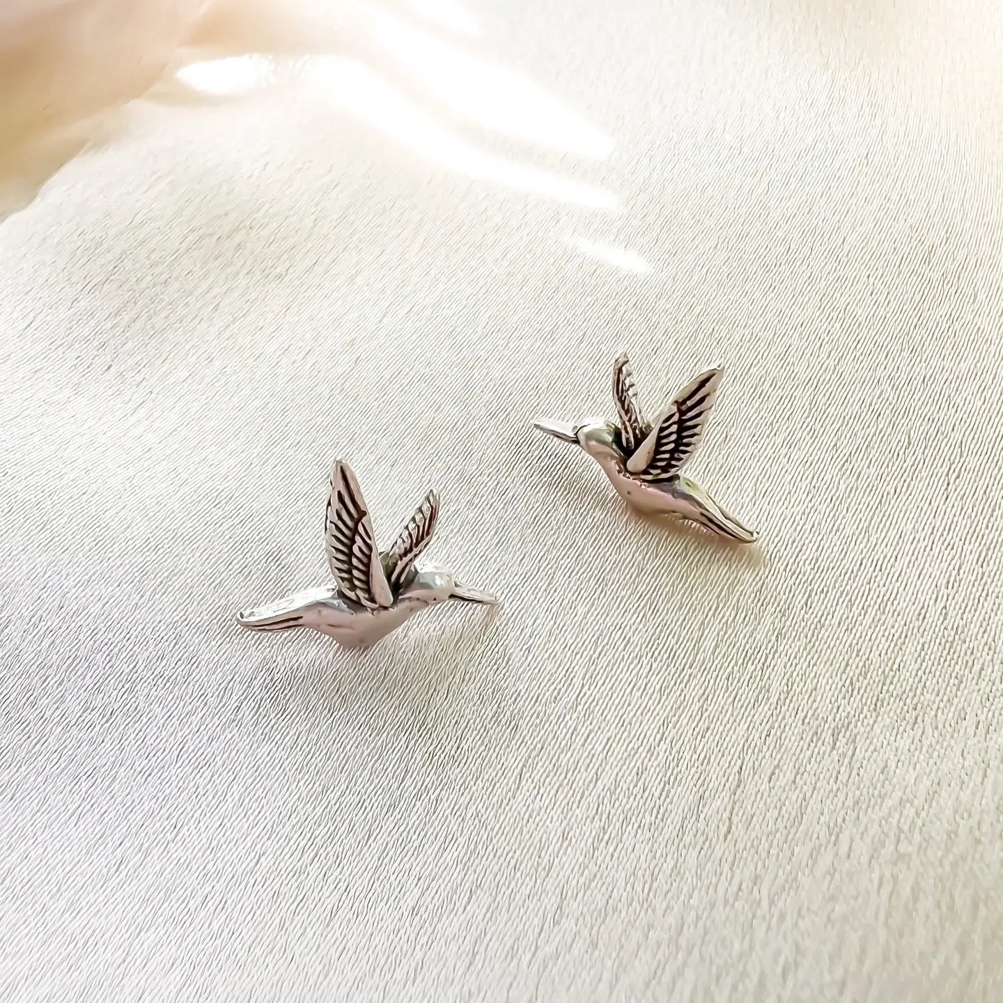 These antique silver plated brass hummingbird stud earrings add a dainty touch to any outfit. The 15x13 mm size is perfect for everyday wear.