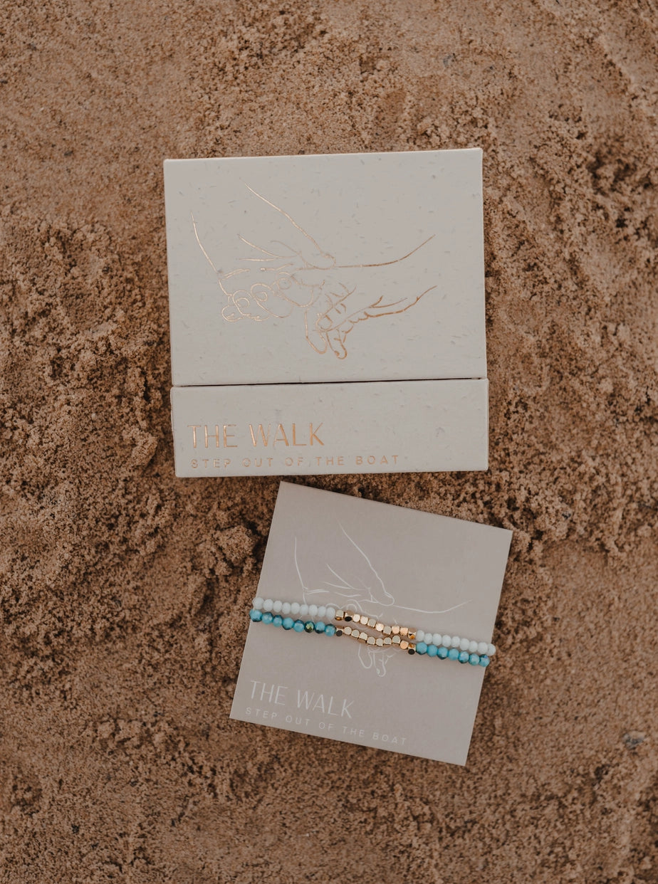There are many things in life you can be known by, choose to be known by the boldness of your faith. Be willing to stand firm in a confidence in Jesus that doesn't make sense to the world around you. When Jesus calls you to walk on water, take the step. When doubt and fear begin to cause you to sink, look to Jesus. His hand is reaching out and ready to rescue you. Follow His voice, it will be worth whatever you have to surrender. Inspired by Peter's story in Matthew 14 The blue bracelet represents the moment in the Bible when Peter stepped out of the boat, and the white bracelet represents Jesus who was there with him, hand outstretched. We believe these bracelets can truly change the world by creating conversations about Jesus. Our prayer is that they can bring hope to the lost, revival to the weary, and courage for the believer.