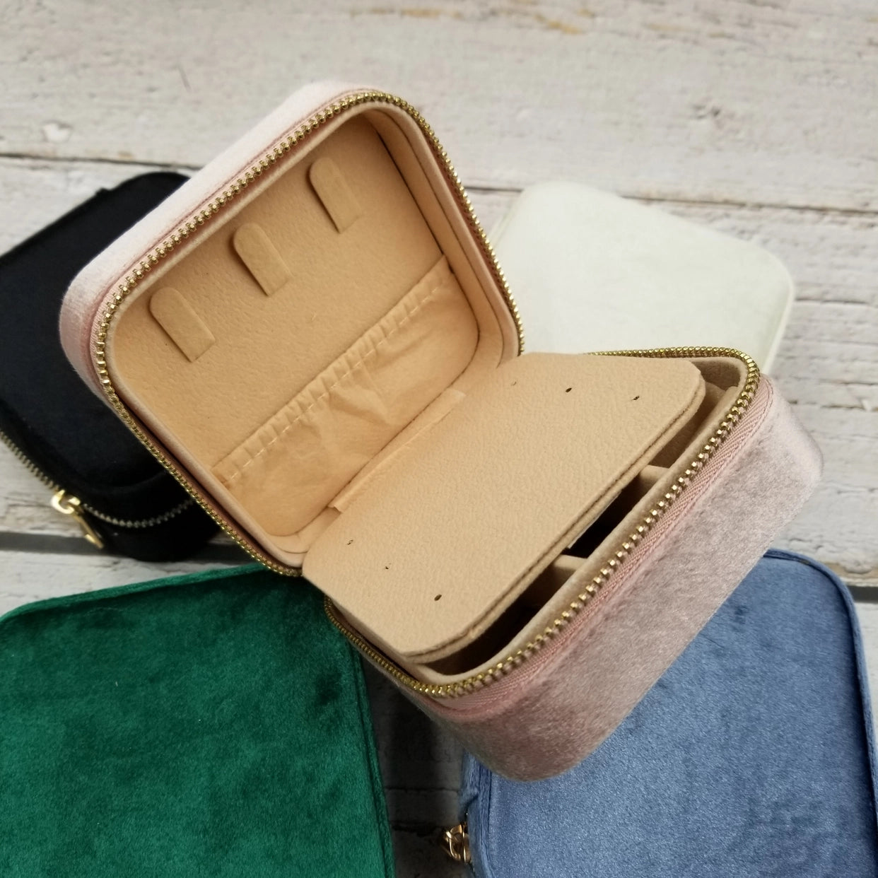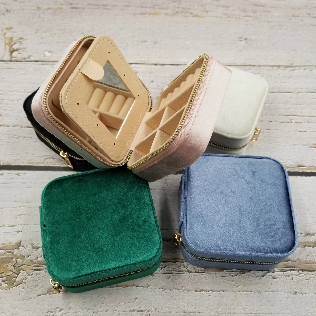 Keep your jewelry organized and protected with this elegant velvet organizer box. Featuring a built-in mirror and compact 3.93" x 1.96" design, it's perfect for storing rings, necklaces, earrings, and accessories at home or while traveling. The soft velvet interior safeguards delicate pieces, while the convenient mirror makes getting ready effortless. Available in five sophisticated colors—pink, black, green, white, and blue—to match your personal style. Lightweight at just 0.22 lb, it's the ideal companion for keeping your treasured jewelry safe and accessible wherever you go.